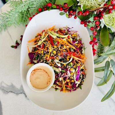 Our Summer Coleslaw contains red & green cabbage, carrot, shallots, charred corn, roasted capsicum, fresh parsley & dill. Served with chipotle, confit garlic & lime dressing served on the side for combining on the day of consumption.
